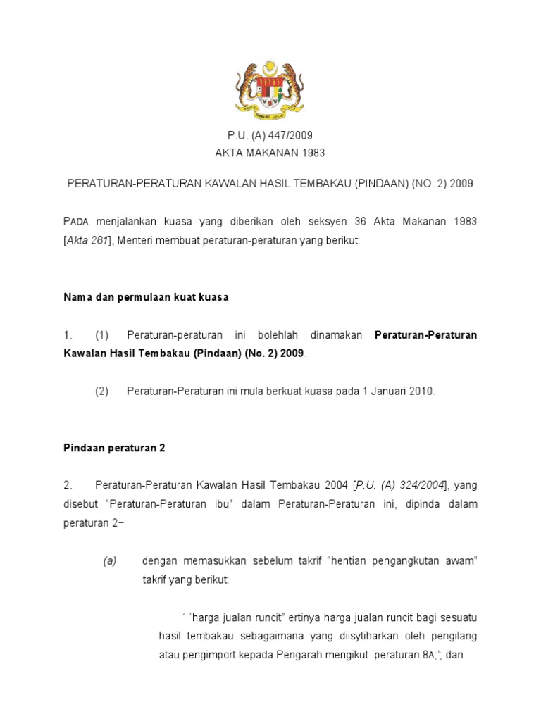 1 Peraturan-peraturan ini bolehlah dinamakan Peraturan-Peraturan. Pindaan pada tahun 2004 diperketatkan lagi agar semakin sukar rakyat mendapat akses kepada rokok. 2 Akta Makanan 1983 Peraturan-Peraturan Kawalan Hasil Tembakau PPKHT Pindaan 2011.